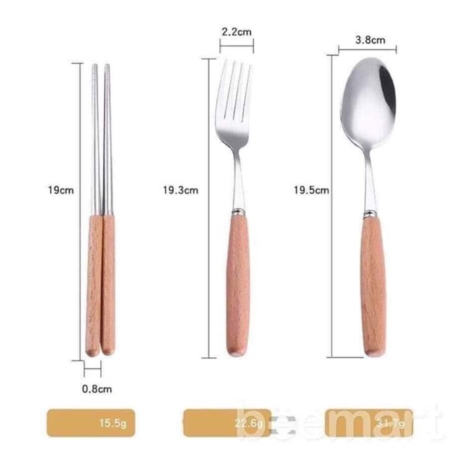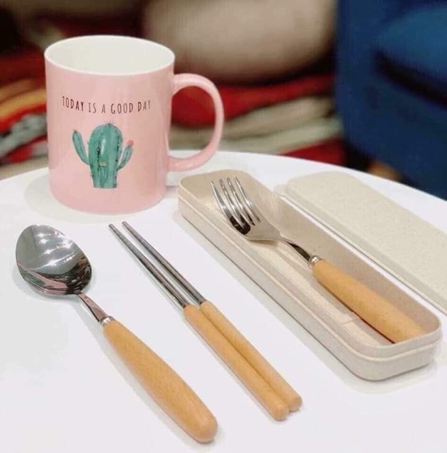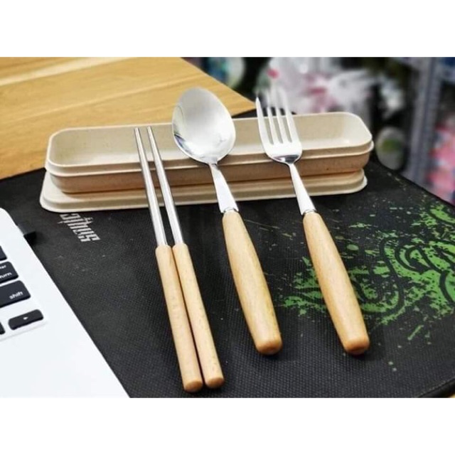 - Bộ gồm đũa, thìa và dĩa inox rất đẹp cán gỗ sồi, đựng trong 1 hộp nhựa lúa mạch sang trọng. Dùng mang cơm đi làm, mang đi du lịch hay picnic tiện lợi.