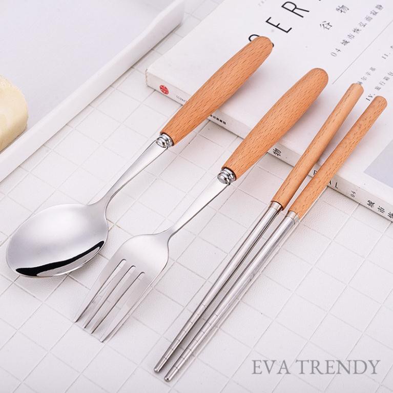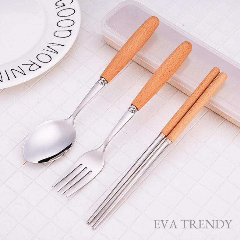 Bộ Thìa Đũa Dĩa Inox Cán Gỗ Lúa Mạch Có Hộp Đựng Cao Cấp