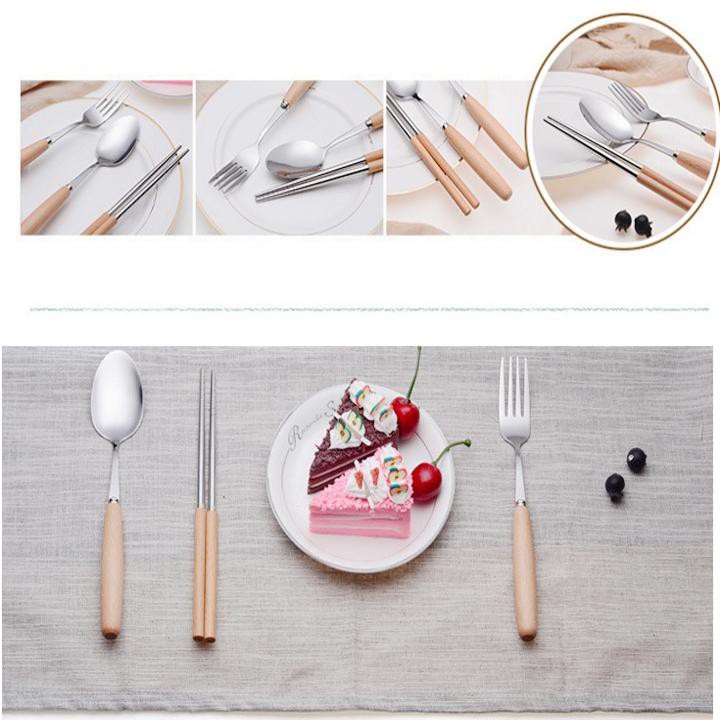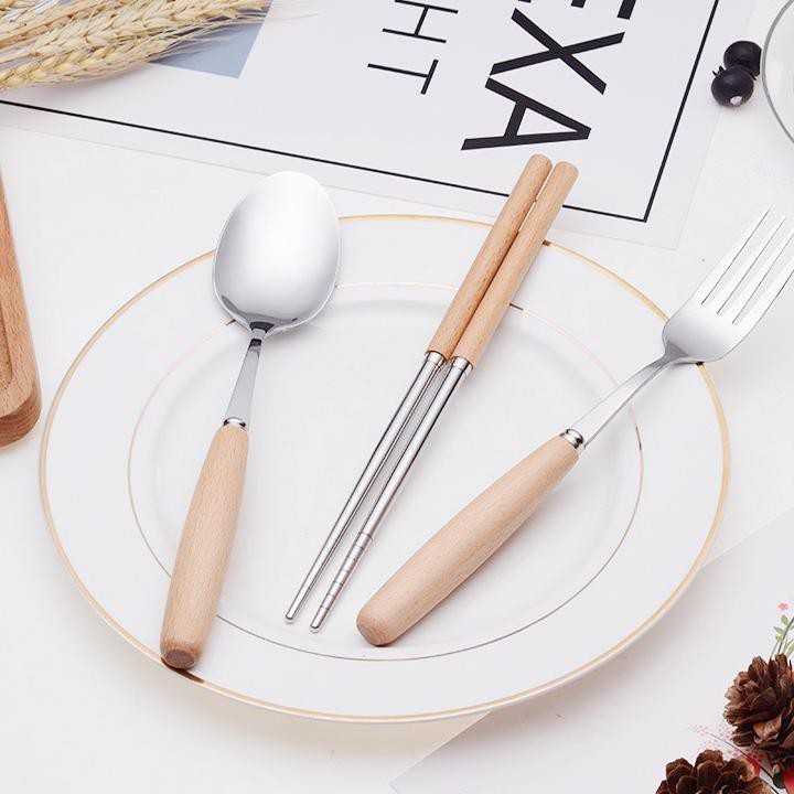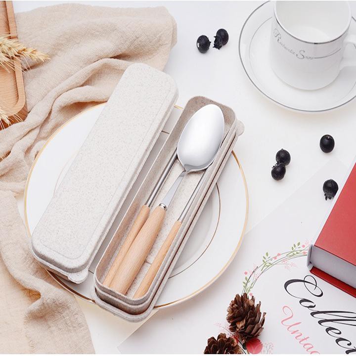 - Bộ gồm đũa, thìa và dĩa inox rất đẹp cán gỗ sồi, đựng trong 1 hộp nhựa lúa mạch sang trọng. Dùng mang cơm đi làm, mang đi du lịch hay picnic tiện lợi.