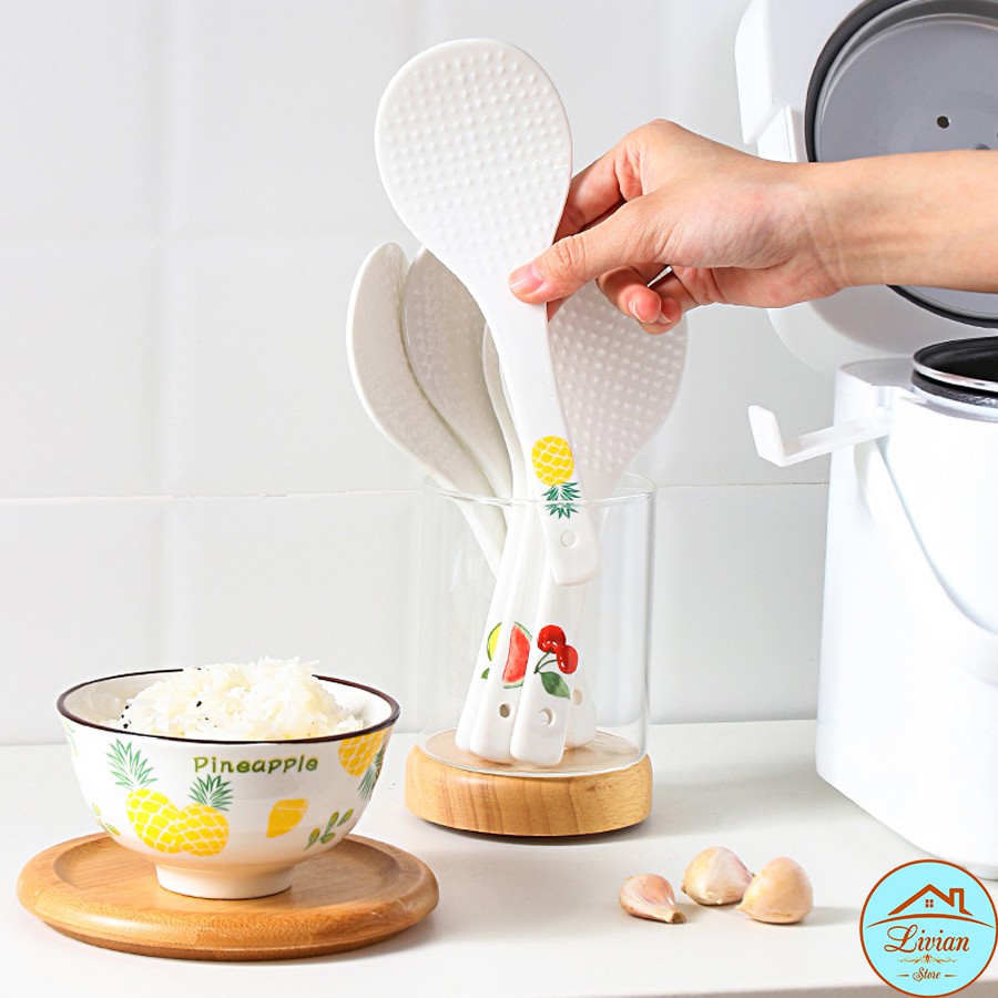 Thìa xới cơm, muỗng cơm bằng sứ trắng cao cấp họa tiết hoa quả cực xinh