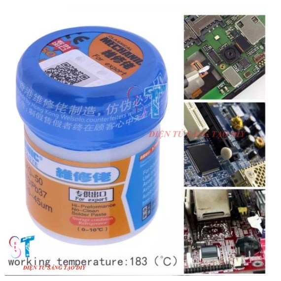 - Thiếc bột Mechanic Solder Paste XG-50 hay còn gọi là kem hàn, thiếc hàn, chì hàn linh kiện dán thường được sử dụng trong các mạch điện tử có linh kiện loại dán.- Chì hàn bột dùng khi hàn, sửa chữa linh kiện dán bề mặt trên mạch điện tử. Phù hợp cho thợ sửa chữa đồ điện tử, điện thoại di động, máy tính bảng...