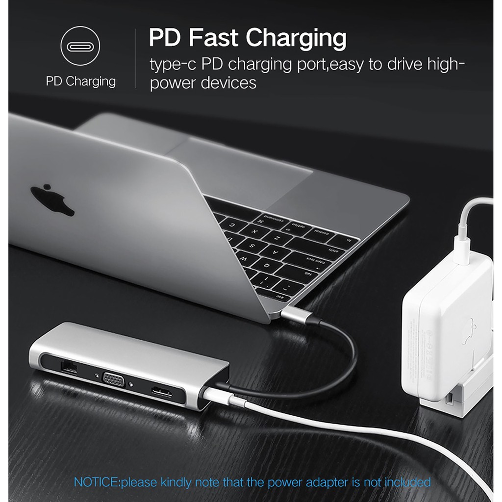 Thiết Bị Chuyển Đổi USB Type-C là linh kiện chuyển đổi đa năng cao cấp chuyên dùng cho các thiết bị hỗ trợ cổng USB Type-C như Macbook, Lenovo,HP....sẽ giúp bạn mở rộng cổng USB Type -C ra đồng thời 1 cổng HDMI, 1 cổng Vga, 3 cổng USB 3.0, 1 cổng Lan (RJ45), 1 đọc thẻ nhớ SD, 1 cổng đọc thẻ nhớ TF và 1 cổng cung cấp năng lượng Type -C PD với công suất lên đến 100W.