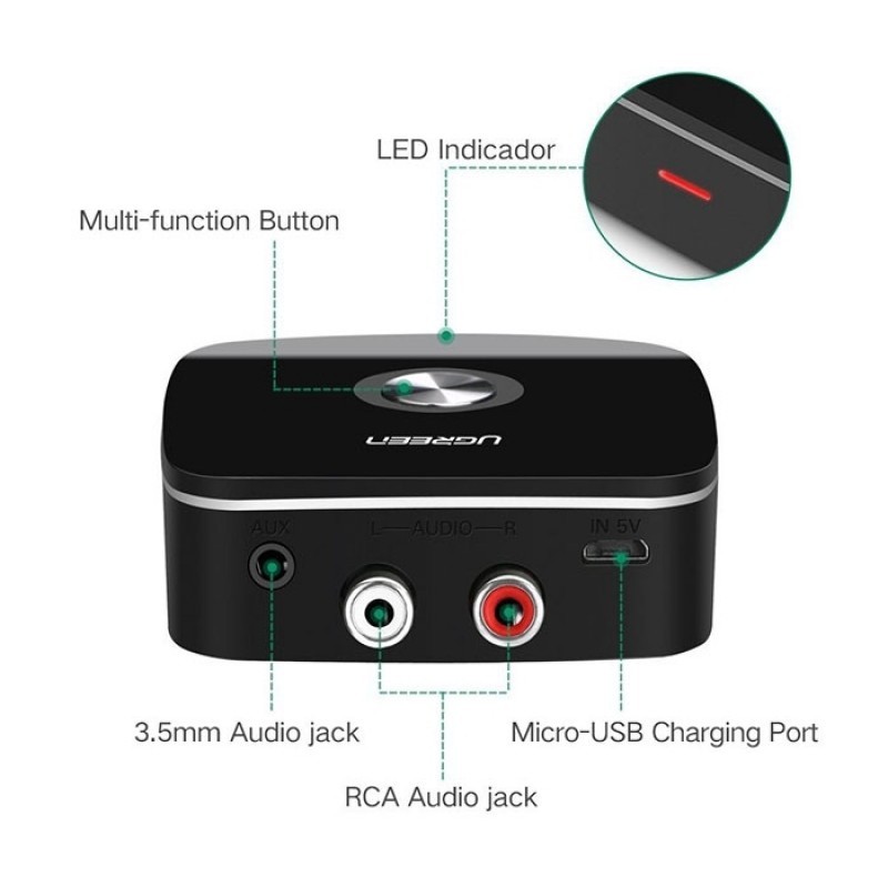 Thiết bị nhận Bluetooth Music Receiver Aux 3,5 mm stereo Ugreen 30445 Cao cấpUgreen Receiver Adapter Bluetooth 4.1 Ugreen 30445 được thiết kế để nhận nhạc từ PC, iPhone, iPad, máy tính bảng hoặc máy nghe nhạc MP3 với âm thanh nổi tại nhà của bạn, loa hoặc hệ thống giải trí với cổng 3,5 mm và cổng RCA , trong đó cung cấp một cách thức mới để dòng nhạc. Nó chuyển đổi loa bình thường của bạn thành một loa bluetooth không dây.
