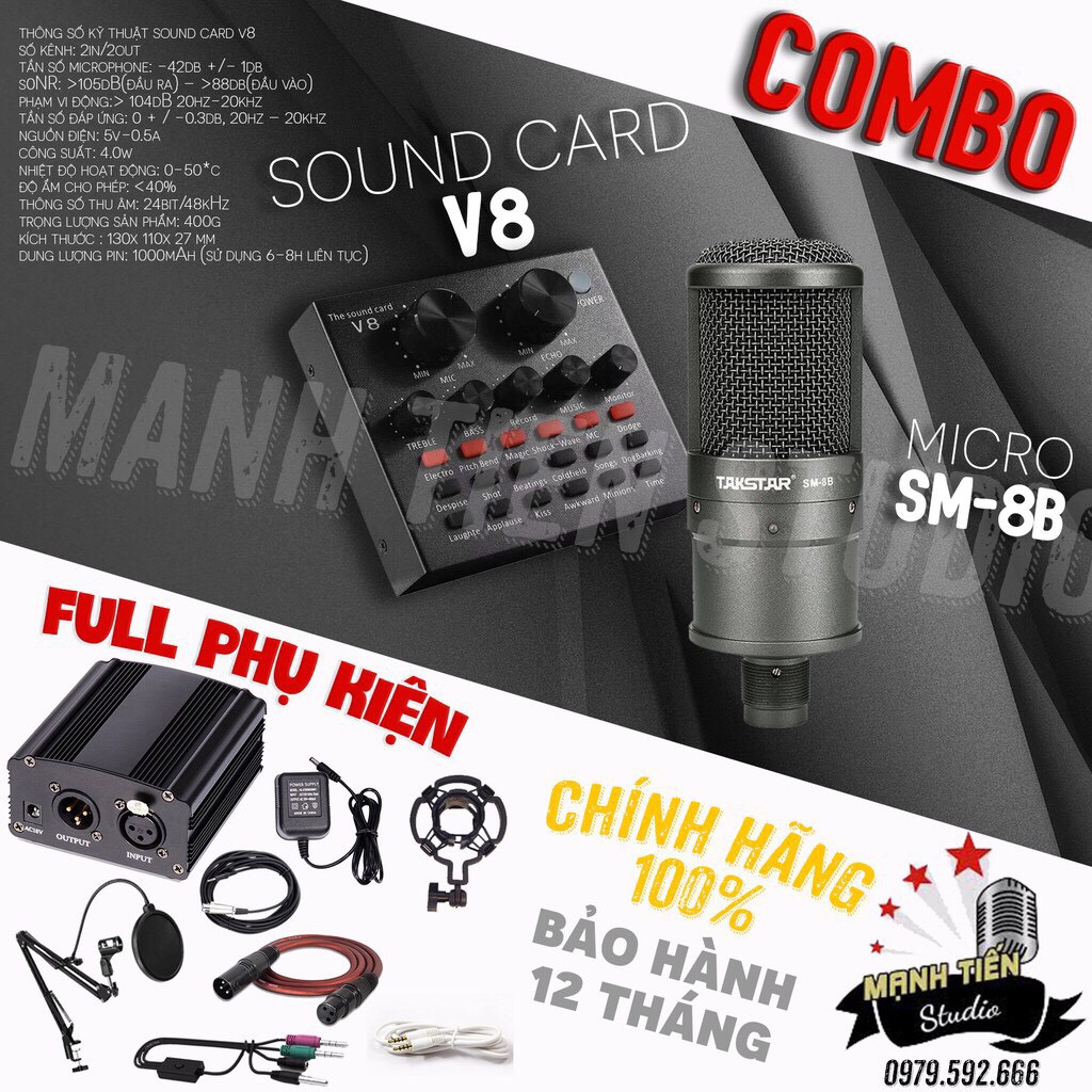 -Combo Micro Takstar SM-8B + Soundcard V8 + Full Phụ Kiện