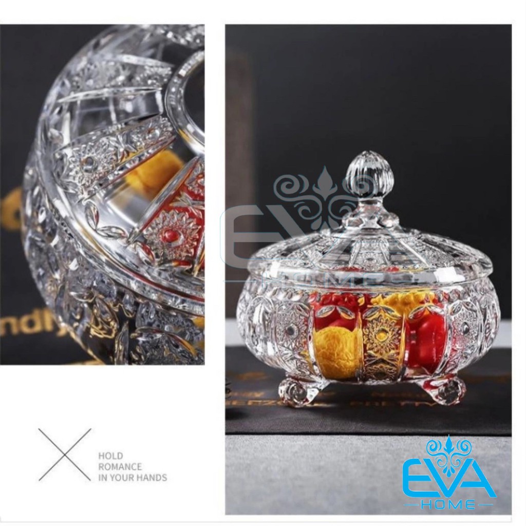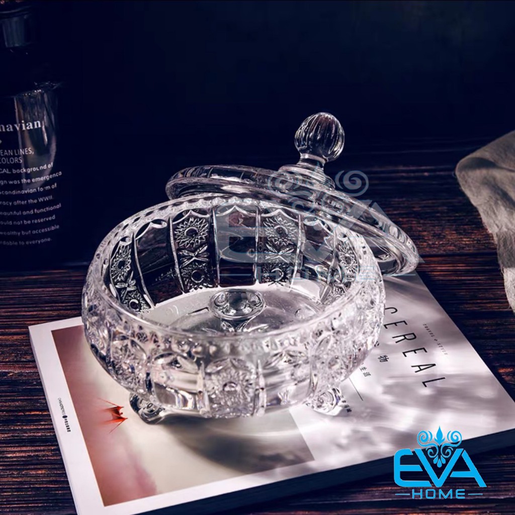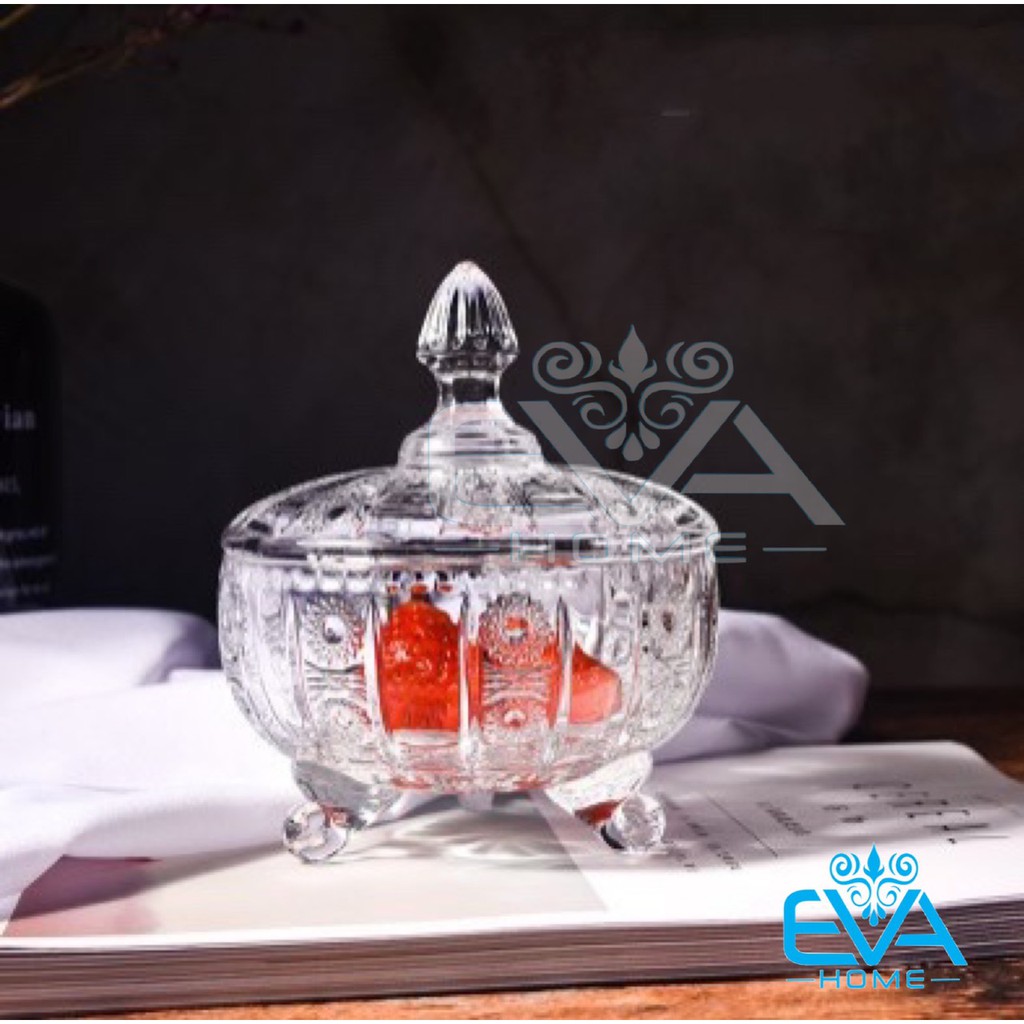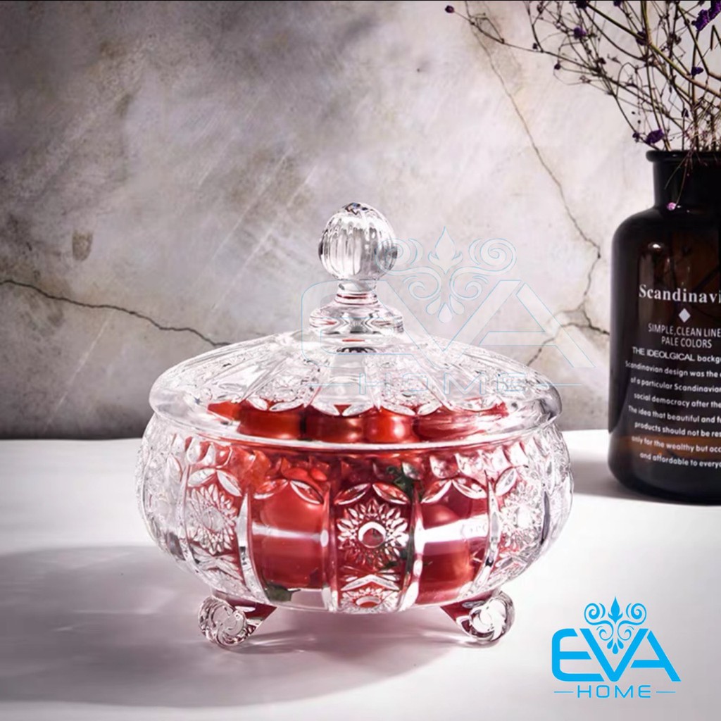 Thố Mứt Thuỷ Tinh Pha Lê 3 Chân Hoạ Tiết Hoa Nổi Nhỏ Phong Cách Royal Sang Trọng / Thố Mứt Tết Nhỏ Deli Tiệp T15 M3171