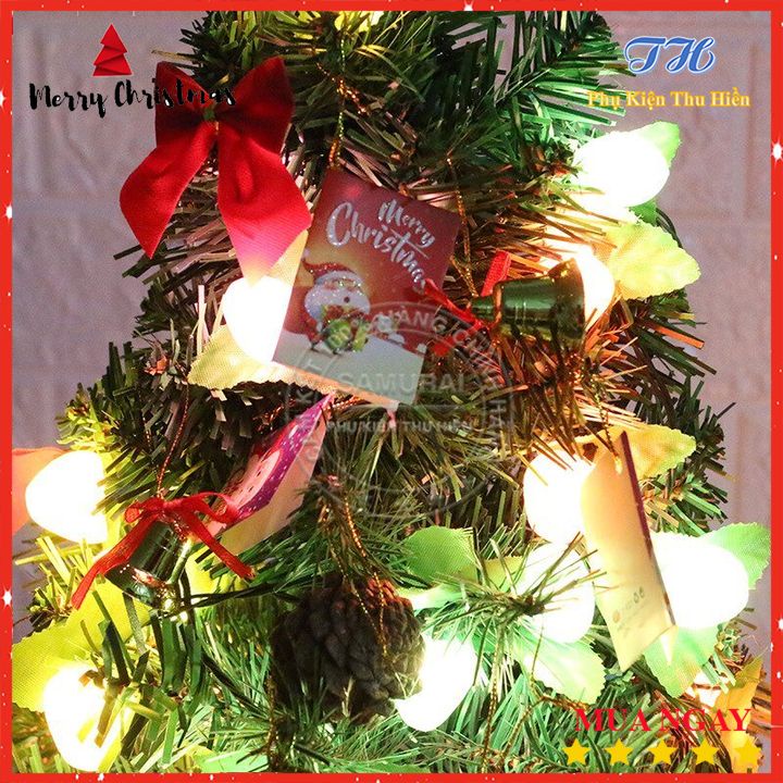 ✅ Phụ kiện gồm: 1 cây thông trang trí noel 60cm, 1 dây led nháy, 1 ngôi sao đỉnh, 2 quả chuông, 2 quả trống, 2 quả thông, 2 chiếc gậy, 2 chiếc kẹo, 8 tấm thiệp giáng sinh.