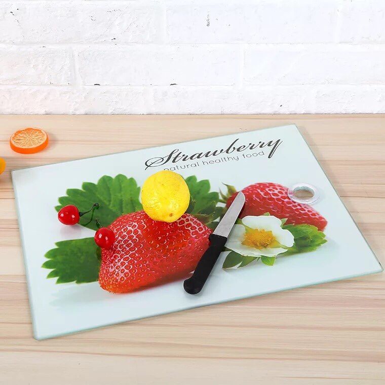 - Với họa tiết trái cây bắt mắt, bề mặt thớt được bọc kiếng chắc chắn, được sử dụng để cắt các loại bánh, hoa quả, rau…Phần đáy của thớt được lót 4 chân nhỏ giúp thớt nằm chắc và tránh bị xê dịch khi cắt.