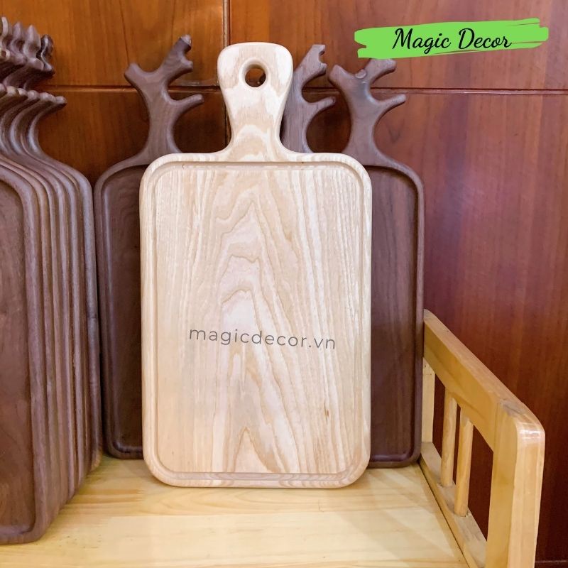 Nhà cửa & Đời sống > Dụng cụ nhà bếp > Thớt || Thớt gỗ decor Magic trang trí hình chữ nhật có tay cầm gỗ tần bì đựng đồ ăn, trái cây sang trọngCòn hàng