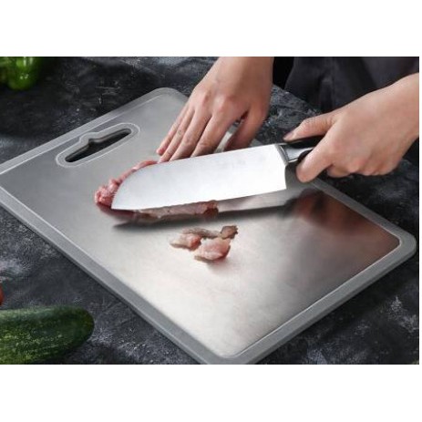 *Thớt inox có độ dày 0,3cm, độ dày vừa phải, cầm chắc tay, tuy nhiên không dày như thớt gỗ, thớt nhựa nên chỉ dùng chuyên kê, thái thực phẩm, hạn chế chặt mạnh để tránh làm tổn thương thớt.