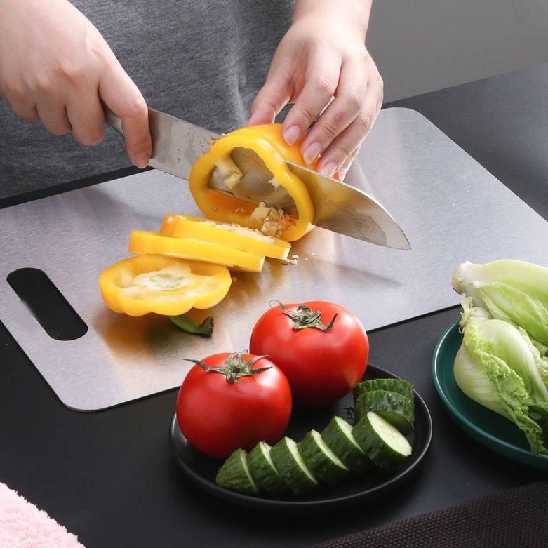 - Thớt inox thoải mái sử dụng không sợ bị rơi võ như thớt kính. Bề mặt inox có độ lì nhất định nên khi cắt thái không bị trơn như thớt kính.