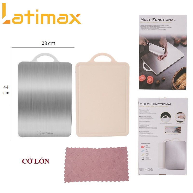 Nhà cửa & Đời sống > Dụng cụ nhà bếp > Thớt || Thớt kháng khuẩn 2 mặt Inox 304 và nhựa PP dùng trong công nghiệp chế biến thực phẩm Cao cấp LATIMAX Size 44 x 28 cmCòn hàng