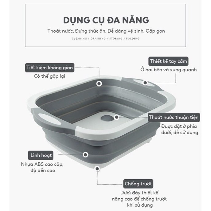 - Công dụng: Chậu rửa rau và có thể gấp gọn để làm thớt thái hoặc băm.