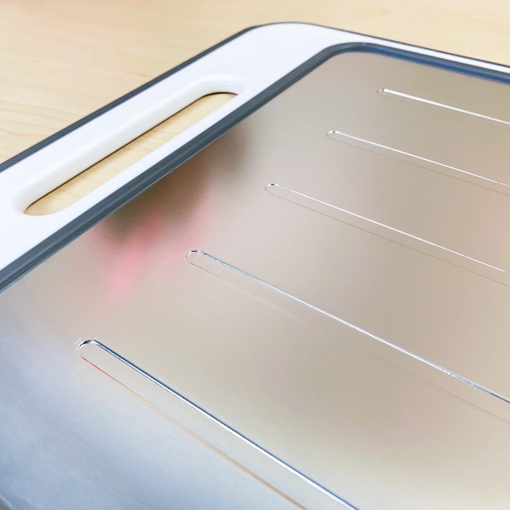 - Ở mặt sau, thớt được làm từ nhựa kháng khuẩn cao cấp và có thể được sử dụng để cắt trái cây, rau củ…