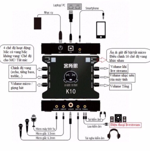 Thông tin bộ sản phẩm bộ thu âm đơn giản :1- soundcard thu âm k10 đủ dây lấy nhạc dây cấp nguồn chính hãng xox.