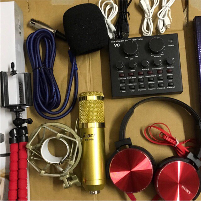 Bộ thu âm mic Ami BM900 soundcard v8 autotune quốc tế V8 full phụ kiện