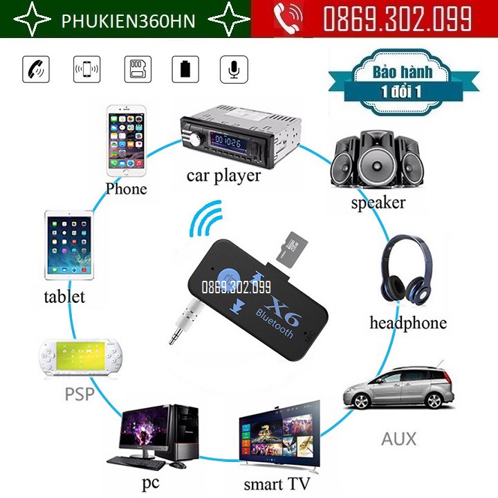 -Thiết bị cắm trực tiếp vào cổng AUX trên xe thông qua jack 3.5mm để mang lại chất lượng âm thanh thực tế, hoàn hảo nhất. Ưu điểm của X6 là có hỗ trợ thêm thẻ nhớ để đọc trực tiếp nhạc và phát lên loa xe.