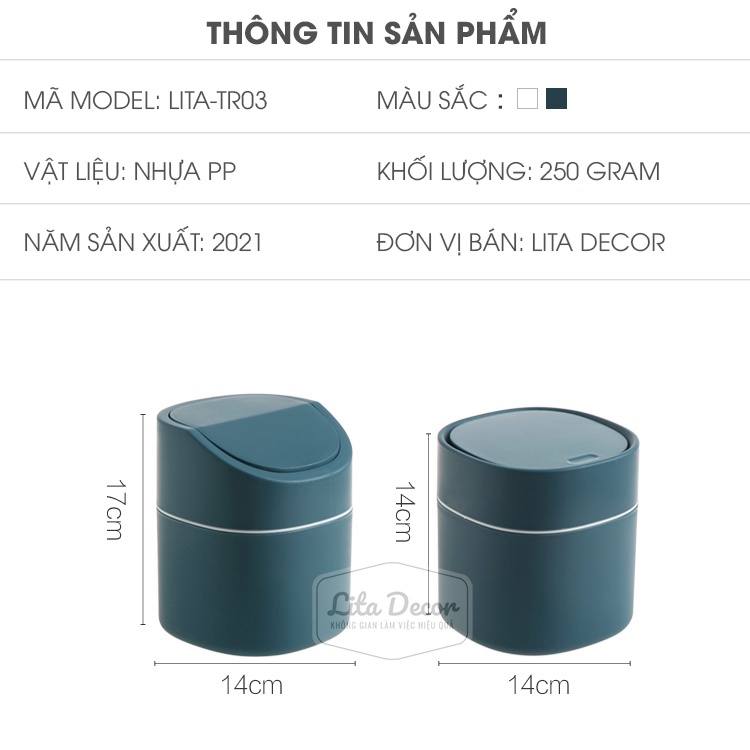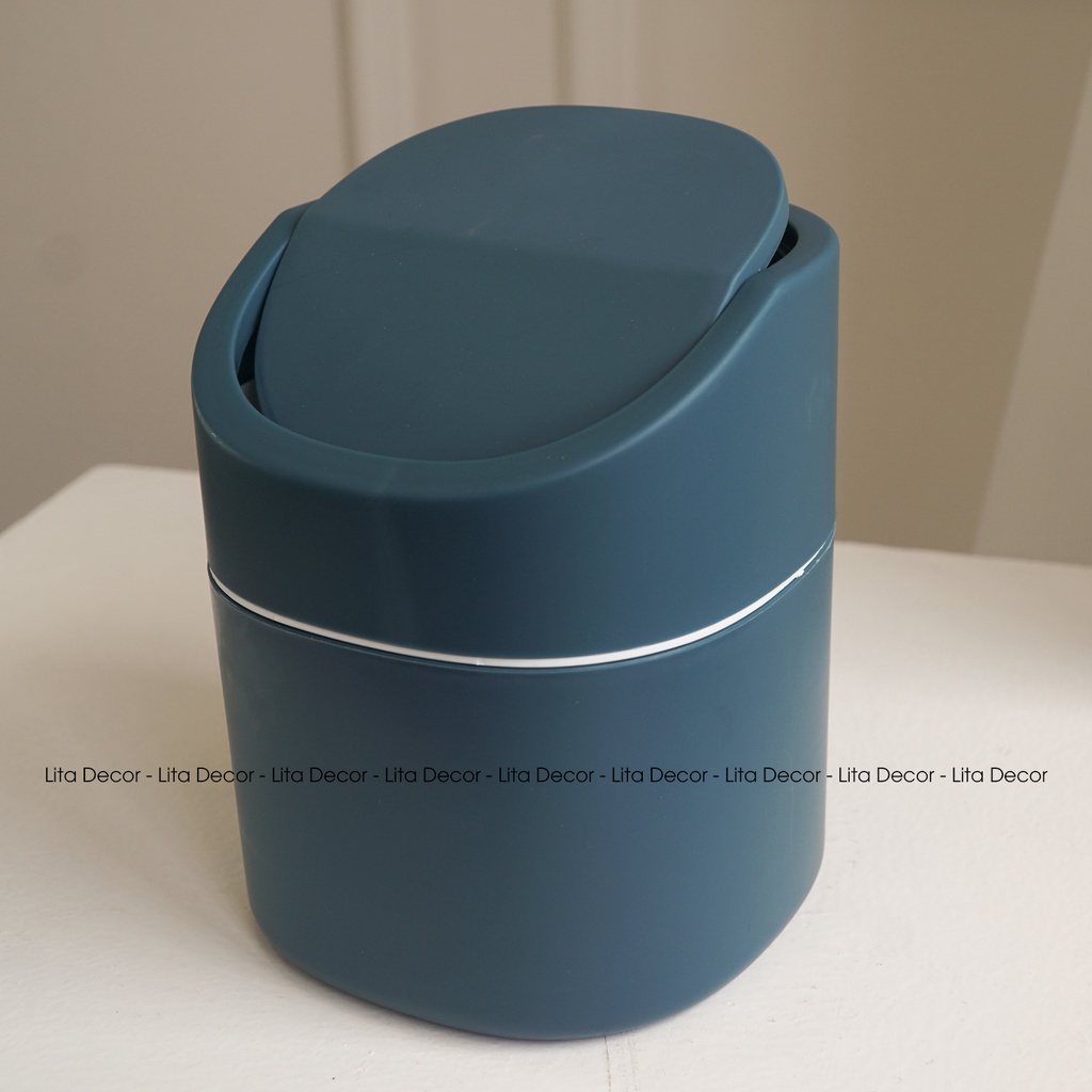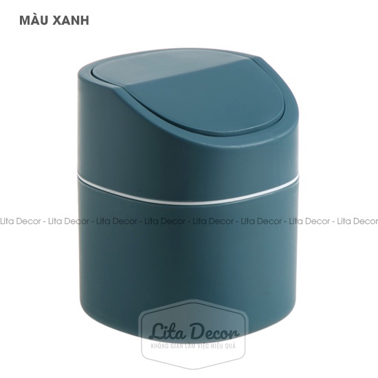 - Chức năng: thùng rác nhỏ gọn, dạng mini để bàn. Dùng để đựng các loại rác nhỏ, khô như đặt tại Bàn Làm việc, Bàn Trang điểm, Bàn trà, Nhà vệ sinh, Bếp. Thiết kế hiện đại với 2 màu Xanh - Trắng tinh tế, Nắp dạng lật. Có thể mở ra để thêm túi rác, tiện lợi và sạch sẽ. Bạn cũng có thể dùng để đựng các đồ vật khác như Hợp đựng.