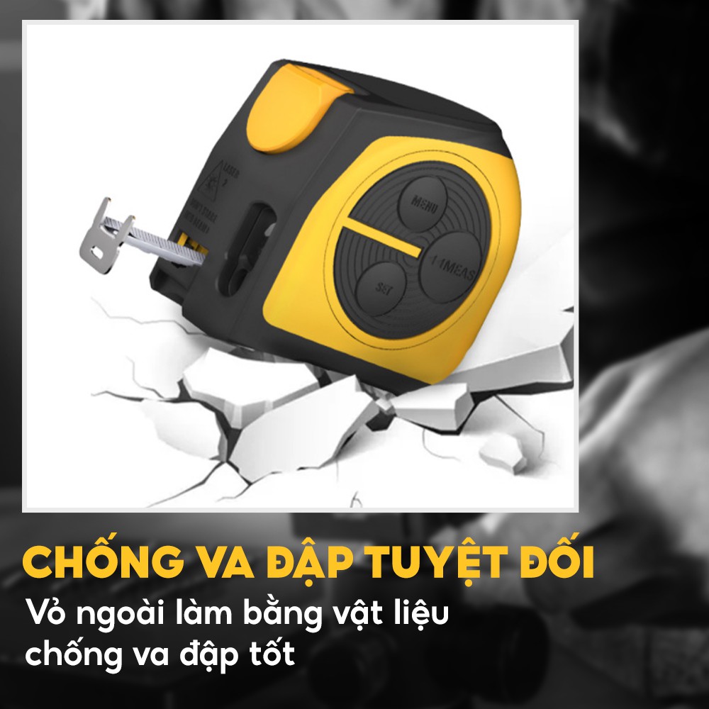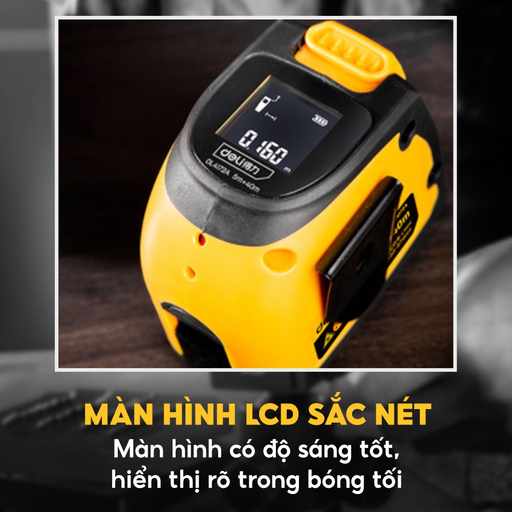 "THƯỚC ĐO ĐA NĂNG LASER CUỘN THÉP 2 TRONG 1 MÀN HÌNH KỸ THUẬT SỐ LCD DELIThước đo đa năng laser cuộn thép 2 trong 1 màn hình kỹ thuật số LCD Deli đáp ứng nhiều nhu cầu đo lường của bạn. Thước đo đặc biệt phù hợp cho thợ thủ công, đo lường trang trí hoặc ứng dụng trong các ngành xây dựng, trang trí nội thất, công trường và các nhu cầu khác trong cuộc sống. Đầu laser chính xác, cảm nhận chính xác dù chỉ là một chút thay đổi về khoảng cách cũng có thể cảm nhận được. Thước cuộn thép laser 2 trong 1 Deli đo khoảng cách xa bằng laser 40m với thước dây 5m để đo khoảng cách ngắn, cho phép bạn nhanh chóng đo khoảng cách thật đơn giản với cổng nhận và cổng phát bằng tia laser. Màn hình kỹ thuật số có đèn nền LCD giúp thước đo cuộn thép 2 trong 1 Deli có thể hoạt động bình thường trong môi trường tối để bạn nhìn rõ kết quả đo dù là ở ban đêm.
