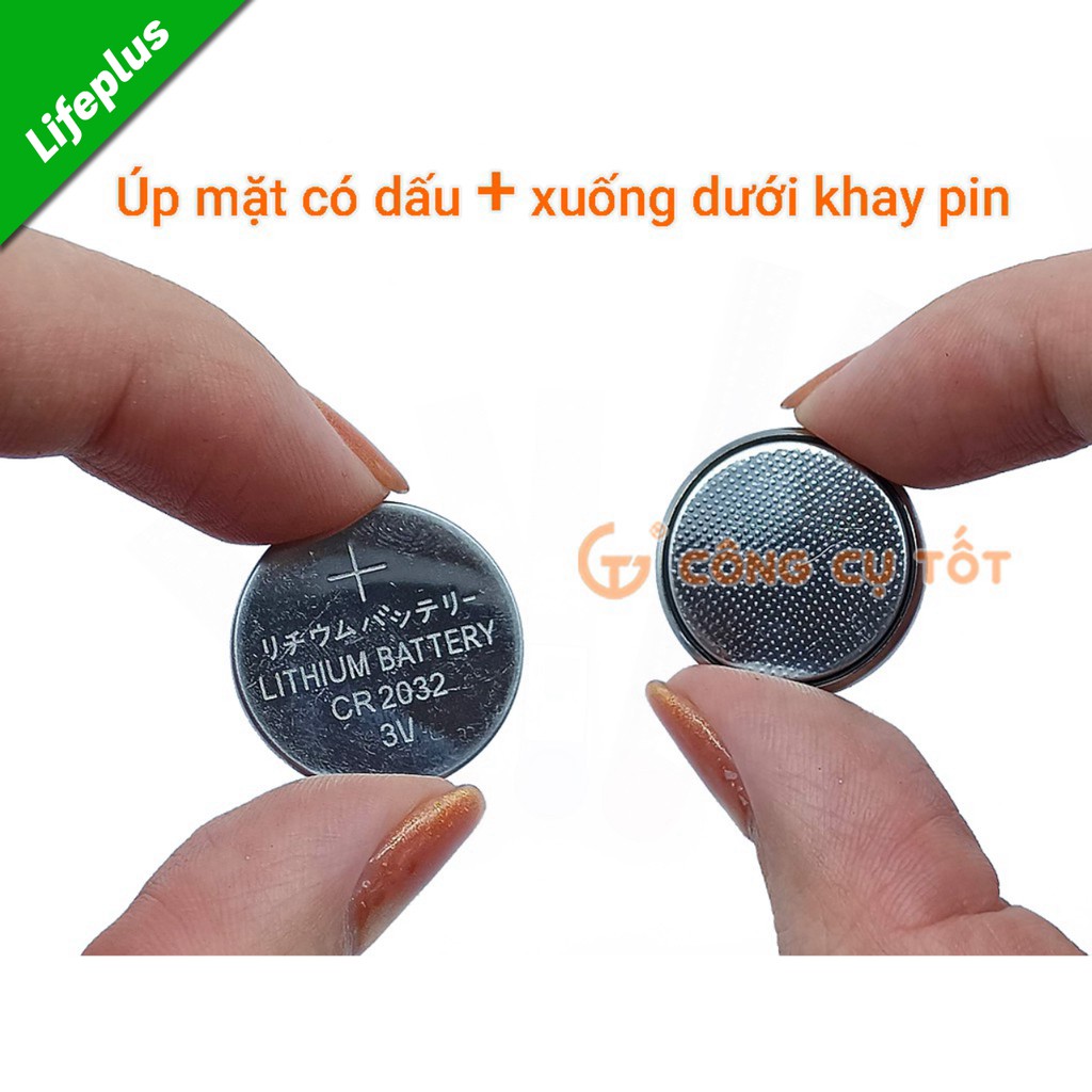 Đi kèm với sản phẩm có 1 pin cúc áo CR 2032 điện áp 3V. Sự kết hợp giữa Lithium và Mangan dioxide tạo ra một loại pin rất ổn định về mặt hóa học, không có thủy ngân thêm, bảo vệ rò rỉ cao. Ngay dưới 3 phím chức năng có 1 nút ấn nhỏ. Người dùng chỉ cần ấn nút này là khay chứa pin bên trên trồi ra.