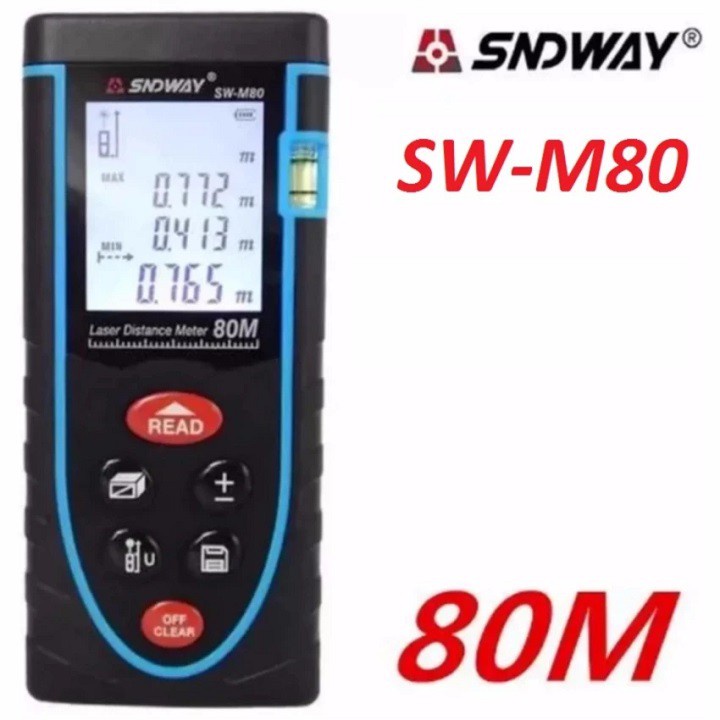 Máy đo khoảng cách bằng tia laser 80m Sndway SW-M80 là thiết bị đo khoảng cách hiện đại, bạn không cần phải sử dụng đến các thước dây, thước mét mà vẫn biết xác định được khoảng cách của vật cần đo.- Máy đo khoảng cách bằng tia laser 80m Sndway SW-M80 được thiết kế nhỏ gọn, kích thước vừa tay người sử dụng. Được trang bị hệ thống đèn laser định hướng giúp xác định chính xác được vật thể cần đo. Màn hình LCD Blacklit lớn có đèn nền hiển thị 4 kết quả đo kế tiếp nhau, đạt tiêu chuẩn IP54 giúp chống bụi hiệu quả khi sử dụng lâu dài giúp người sử dụng có thể quan sát được số liệu ngay cả khi điều kiện ánh sáng trong tốt.