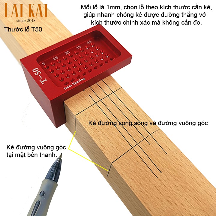 • T50 có các lỗ từ 5mm đến 49mm để kẻ vạch lấy dấu