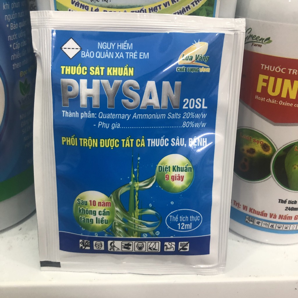 Thuốc Sát Khuẩn PHYSAN 20SL - Gói 12mlThuốc sát khuẩn Physan 20SL có đặc tính sát khuẩn cực mạnh, đặc trị các bệnh vàng lá, thối nhũn, thối thân, thối hạt cho các loại cây trồng. có phổ tác dụng rộng và tiêu diệt hầu hết các mầm bệnh gây hại cho cây trồng như: Nấm, vi khuẩn, rong rêu, tảo,..