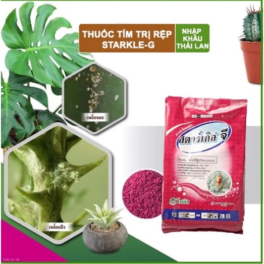 Thuốc Tím Trị Rệp chính hiệu của Thái Lan (Không như mấy hàng trôi nổi phải rải với lượng rất nhiều lần mà chất lượng lại không bằng).- Chỉ cần rải lên mặt chậu, thuốc sẽ tan và cây sẽ hút qua rễ và lưu dẫn toàn thân.