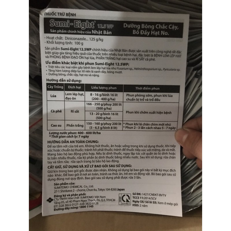 Sumi-Eight 12.5wp là sản phẩm chính hiệu của Nhật Bản. Được nhiều nhà khoa học trên toàn thế giới khuyên dùng.Với công thức đặc biệt sumi-eight 12.5wp giúp đánh bay được các bệnh hại do nấm gây ra như: Lem lép hạt và đạo ôn ở lúa, Rỉ sắt ở cây cà phê và phấn trắng ở cao su.