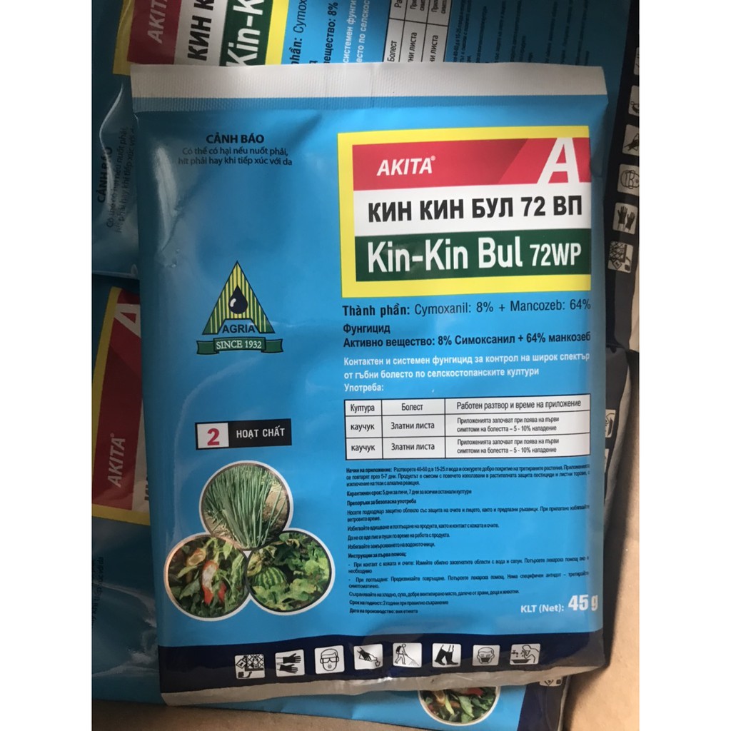 - Kin Kin Bul 72WP là chế phẩm trừ bệnh hỗn hợp giữa 2 hoạt chất Mancozeb và Cymoxanil có tác động tiếp xúc nội hấp và lưu dẫn mạnh.