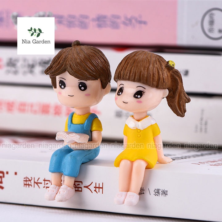 Tiểu cảnh cặp đôi học sinh ngồi ghế tượng mini trang trí vườn chậu cây terarium hồ cá Nia Garden N5