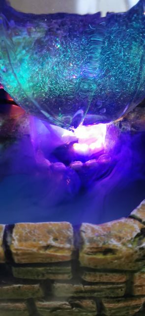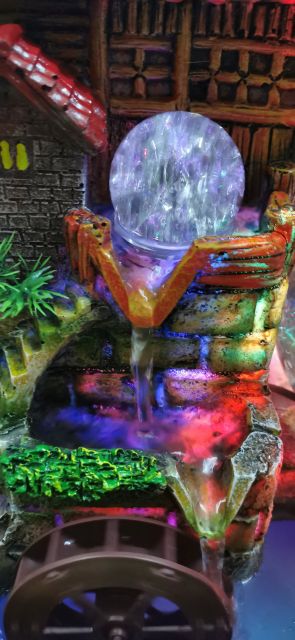 Thác nước phong thủy mini còn có quả cầu ánh sáng bằng đèn Led. Ánh sáng xoay chuyển. Tượng trưng cho Nhật- Nguyệt. Xoay chuyển vận mệnh từ u tối sang trạng thái có hào quang chiếu rọi. Ở đó có nhà có cây cối xanh tươi với tiếng nước chảy róc rách ngày đêm.