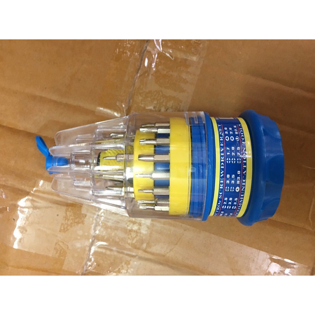Bộ tua vít 31 đầu cỡ nhỏ dành cho sửa chữa đồ điện tử, gia dụng như máy vi tính, laptop, điện thoại di động, xe đạp..Sản phẩm được thiết kế đủ tất cả các loại đầu vít thường dùng trong linh kiện điện tử như đầu dẹt, đầu 2 lỗ, tam giác, lục giác, 3 cạnh, 4 cạnh, 5 cạnh và 6 cạnh, mỗi dạng đều có đủ các cỡ từ lớn đến nhỏ.