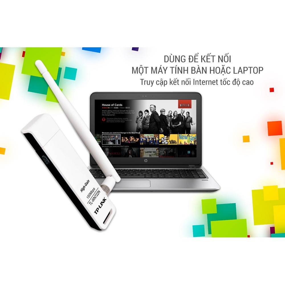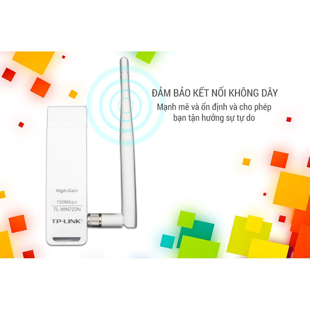 Bảo hành : 24 tháng bảo hành chính hãng toàn quốcUSB Wifi (high gain) TP-LINK TL-WN722N hỗ trợ người dùng cài đặt các máy tính hoặc máy tính xách tay ở vị trí thuận tiện nhất có sẵn, mà không cần phải có dây cáp mạng. Sản phẩm tương thích với các thiết bị theo chuẩn 802.11b/g/n, thiết bị cung cấp tốc độ không dây lên đến 150Mbps, tuyệt vời hơn cho việc chơi game trực tuyến hoặc thậm chí cả các dòng video.