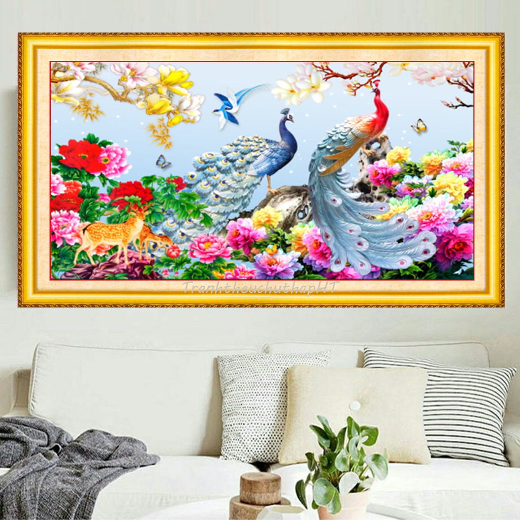 Mẫu này rất đẹp, thêu toàn bộ các sinh vật, đôi chim công, hoa hoa mẫu đơn hoa lan, thêu các chi tiết trên nền vải 3D in sẵn nét rõ đẹp, màu sắc tươi sáng, sang trọng, phần thêu như hình đính kèm