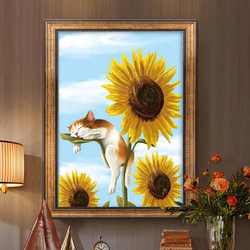 Tranh thêu chữ thập chỉ lụa mèo và hoa hướng dương DW0624