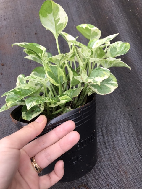- Cây trầu bà size lá nhỏ có màu xanh loang lỗ trắng rất đẹp. Đây là loại cây thân bò dễ sống, dễ chăm sóc, chịu bóng râm, ánh sáng nhẹ nên thích hợp dùng trong trang trí nội thất, sân vườn.- Cây còn có tác dụng thanh lọc không khí, cải thiện môi trường.