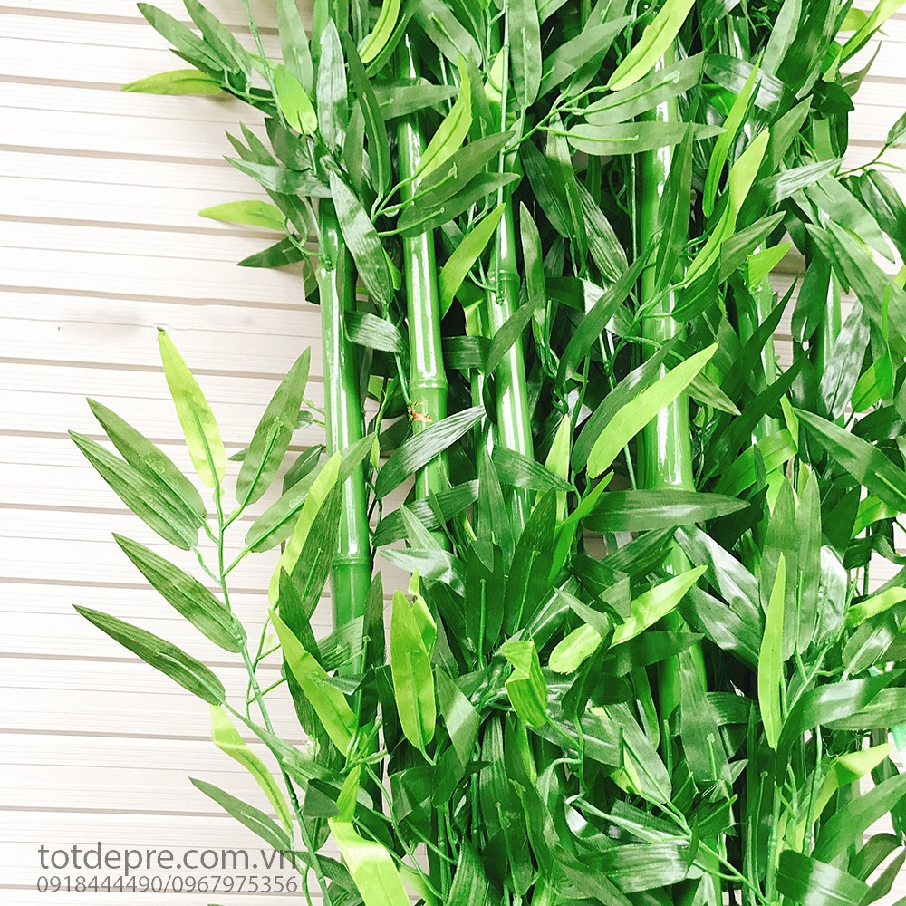 Lưu ý đây là loại cây tre nhiều lá, gồm 4 nhánh lá. Lá mềm mại, màu sắc như thậtThân cây tre to, đường kính từ 1.7cm - 2.2cm. thân cây thật bọc nhựa xanh, nên thân có độ bóng,màu xanh mướt bắt mắt.