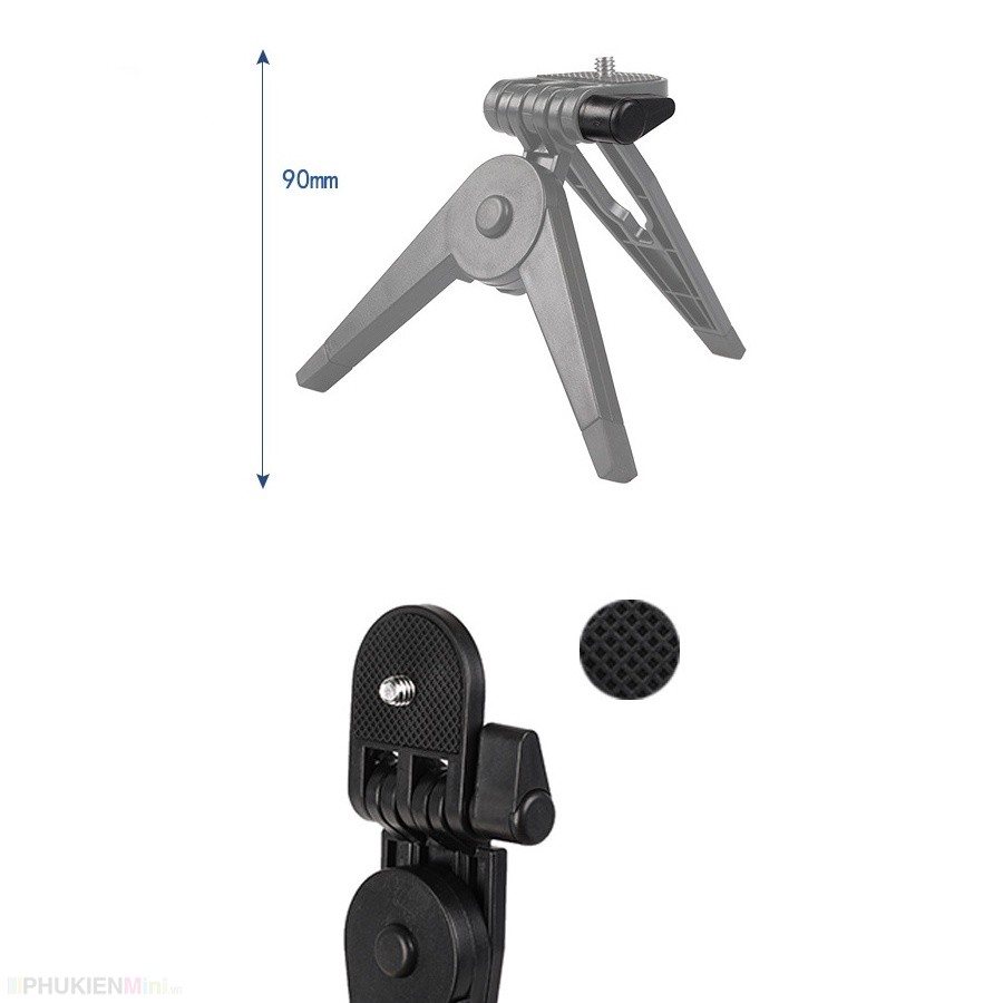 Tripod mini được làm bằng chất liệu nhựa ABS, chiều cao tối đa 90mm, tải trọng tối đa 0.5kg.