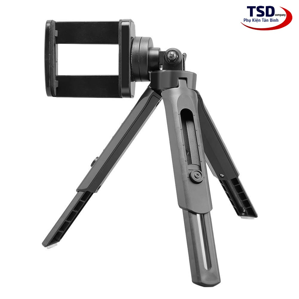 - 3 chân của tripod có thiết kế chống trượt và có thể gấp lại, xòe ra tiện dụng. Tripod có chiều cao tối đa là 13.5 cm (không tính gá kẹp) nhỏ gọn phù hợp đặt trên bàn hay một số vị trí có diện tích nhỏ.