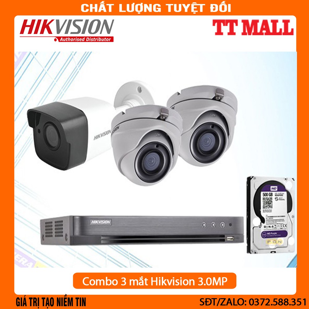 [Mã ELHAMS5 giảm 6% đơn 300K] Trọn bộ 3 camera HIKVISION 3.0 Megapixel kèm HDD 500G và 60 mét dây liền nguồn