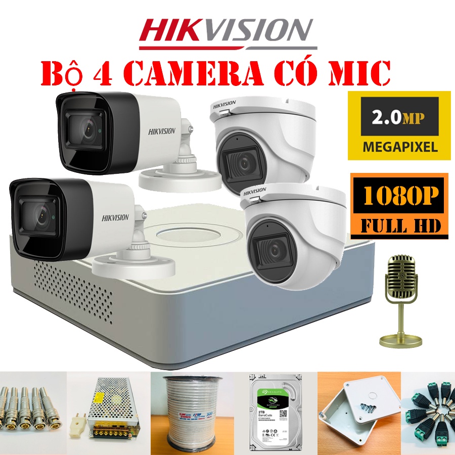 Trọn bộ 4 camera Hikvision Chính Hãng 2Mp Full HD 1080P, Được kết hợp mắt DS - 2CE16D0T - ITFS và DS - 2CE76D0T - ITMFS tích hợp MIC giúp khách hàng có thể nghe và lưu trữ được cả hình ảnh lẫn âm thanh ở khu vực lắp camera. Hình ảnh cực đẹp và sắc nét. Trọn bộ đã được kèm đầy đủ phụ kiện lắp đặt. Quý khách hàng mua về không cần mất thêm phụ phí. Phù hợp lắp cho nhà ở, đường phố, văn phòng, trường học, trông trẻ nhỏ, cửa hàng và các khu vực lắp ngoài trời…Trọn bộ camera Hikvision bao gồm: