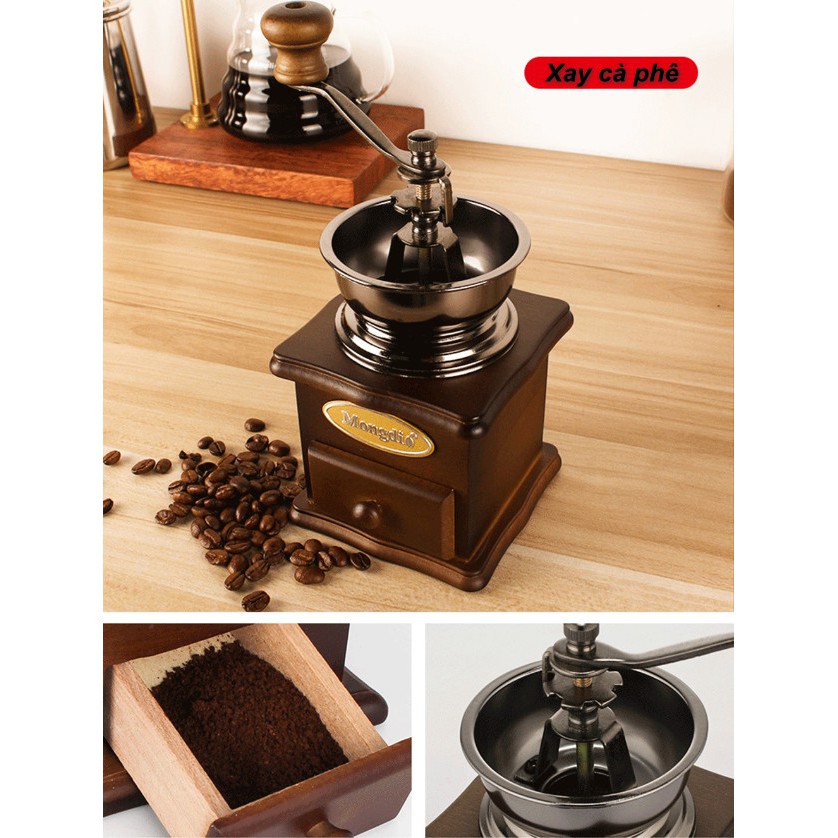 - Chất liệu của dung cụ xay cà phê : Gỗ + kim loại