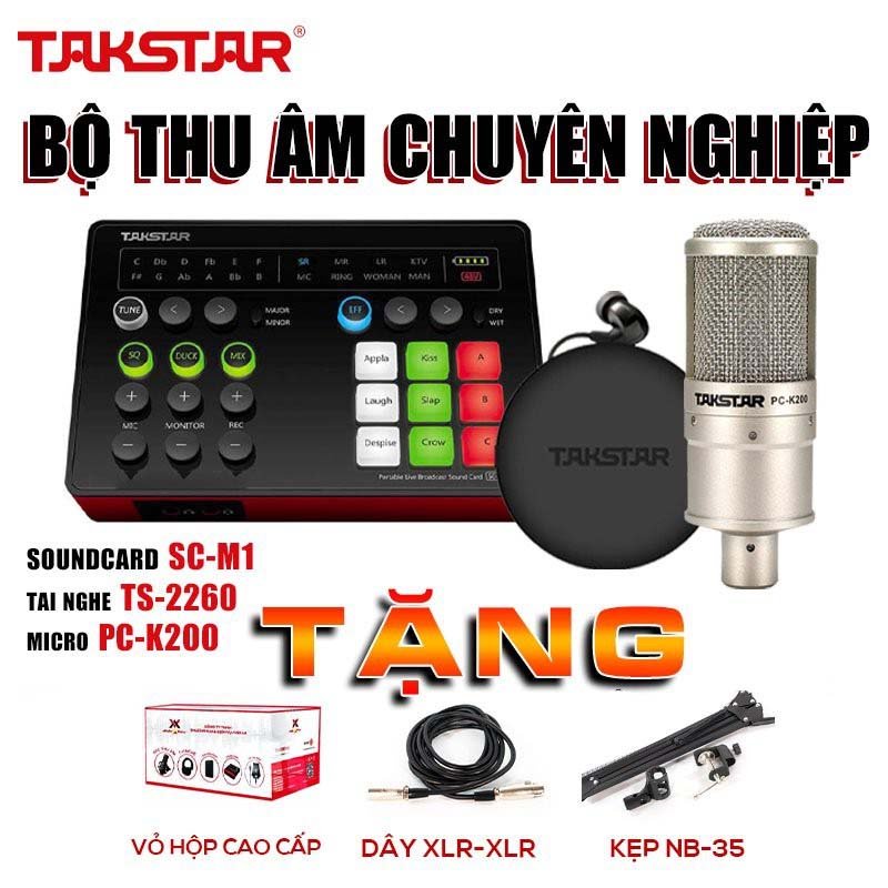 Trọn bộ combo thu âm,hát live stream chuyên nghiệp: SOUNDCARD SC-M1, MIC TAKSTAR PC 200 và TAI NGHE TS-2260