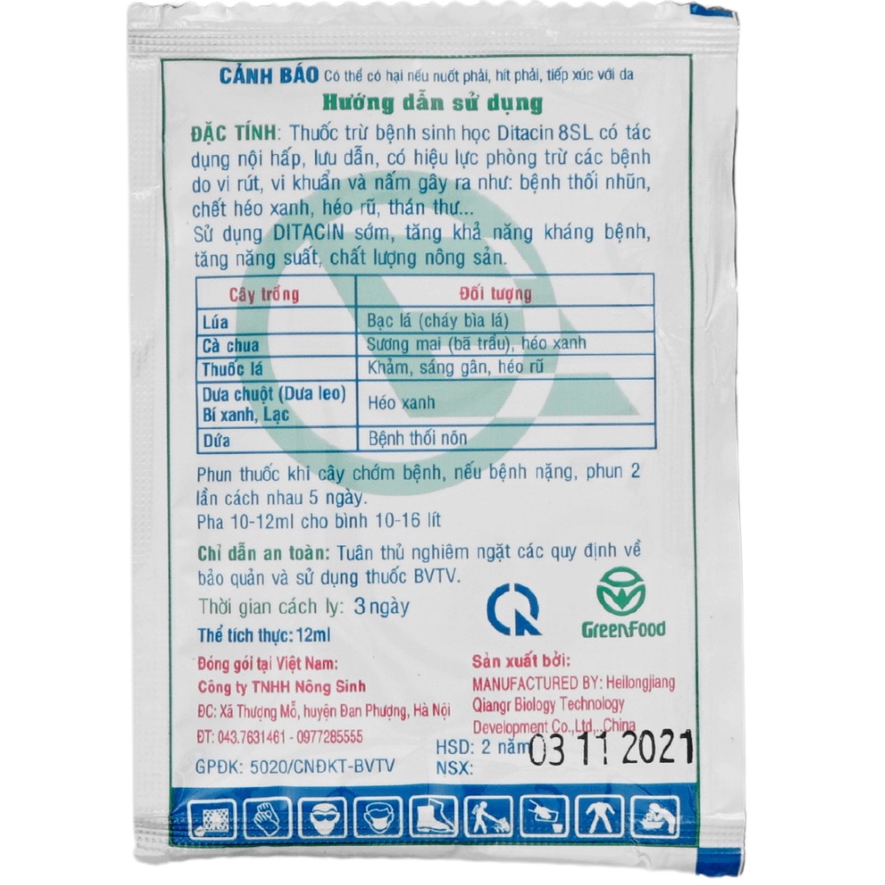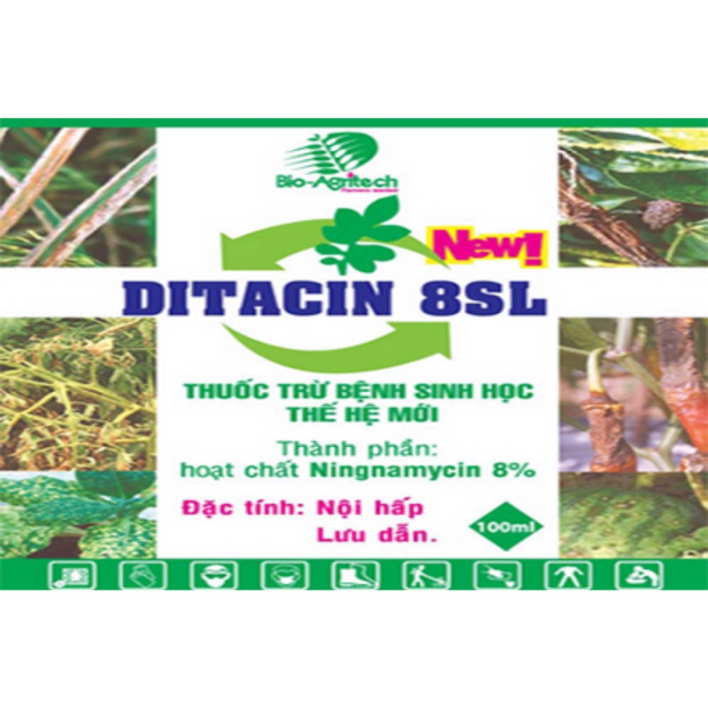 - DITACIN 8SL có phổ tác động rộng, trừ được nhiều loại bệnh do nấm, vi khuẩn trên nhiều cây trồng như lúa, rau màu, cây công nghiệp ngắn ngày, dài ngày và đặc biệt có hiệu quả với một số bệnh virus như TMV, CMV và PYV trên th lá, ớt, cà chua, khoai tây.