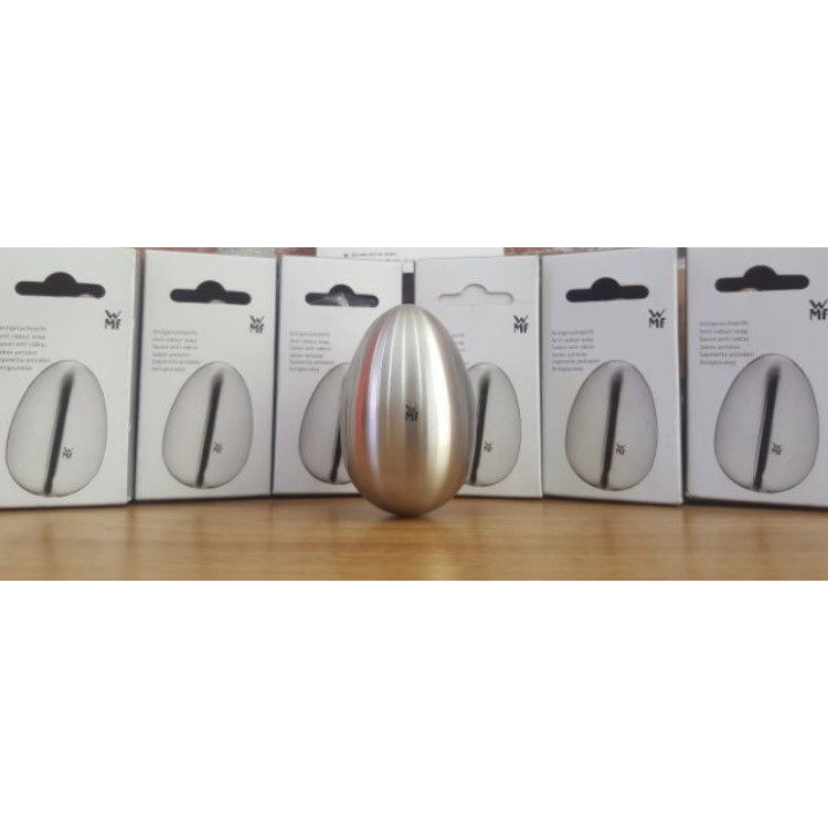 + Xà phòng kim loại dạng hình trứng giúp luôn đứng vững và tiện dụng khi để cạnh bồn rửa tay, vừa là vật trang trí đẹp mắt. Viên rửa tay khử mùi WMF Anti-Geruchseife Gourmet Made in Germany nhanh chóng làm sạch mùi trên tay sau khi chế biến cá, thịt, tỏi, hành…, khử sạch thực phẩm và mùi gia vị trên tay một cách nhanh chóng và lành tính. Theo kinh nghiệm người dùng quả trứng kiêm loại khử mùi WMF này dùng được rất rất lâu. Có lẽ công thức chế tạo ra nó vẫn còn là một bị mật của hãng sản xuất nội thất nhà bếp WMF.