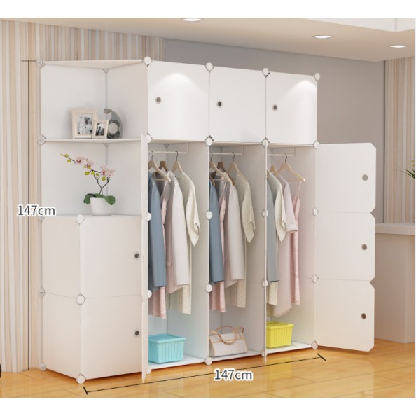 Gồm tất cả 16 ngăn tủ: 14 ngăn tủ lớn vừa gấp vừa treo đồ, 2 ngăn tủ xéo có thể trang trí đồ lưu niệm hoặc túi xách...