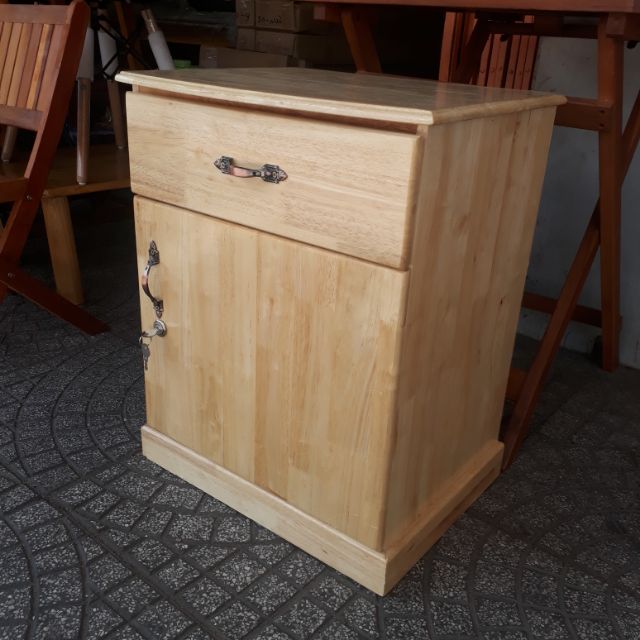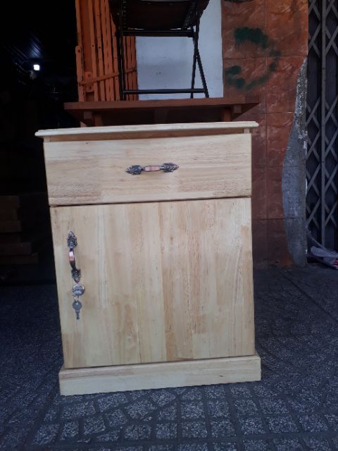 Tủ đầu giường được gia công bằng gỗ cao su tự nhiên. Xử lý chống mối mọt. Gồm 1 ngăn kéo và 1 cánh cửa mở.Kích thước tủ :