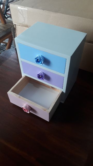 - Kích thước tủ 16x12x19Tủ nữ trang được gia công bằng gỗ thông, MDF phun màu láng mịn, bảo đảm đẹp nha quý khách. Kết hợp 3 màu rất dễ thương. Hộc kéo khi kéo ra sẽ có chốt giữ lại. Chứ ko phải kéo ra là đi nguyên hộc ra luôn nhé.