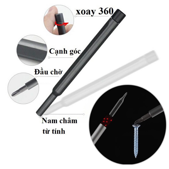 ✔Đầu tuốc nơ vít đều được tích hợp nam châm => dễ dàng bắt ốc