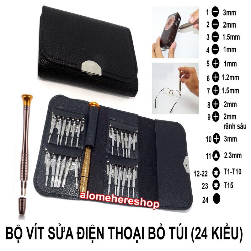 Tua vit sửa điện thoại, camera, đồng hồ -Bộ Tovit Bỏ Túi Nhỏ Gọn Tháo Sửa Điện Thoại Laptop 24 Đầu Kèm Bao Da